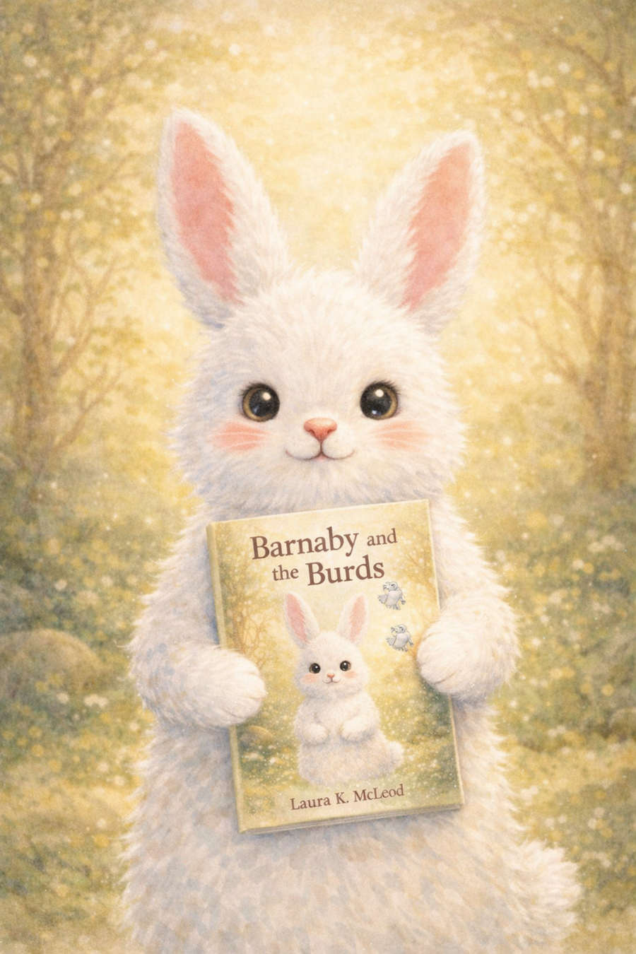In Barnaby and the Burds, Barnaby is portrayed as a thoughtful white bunny with soft fluffy fur, pink inner ears, and bright dark eyes. His naturally kind nature often leads him to say yes whenever others ask for help. Along the way, Barnaby begins collecting “Burds,” symbolic birds that represent the burdens he takes on when he agrees to more than he can comfortably manage.